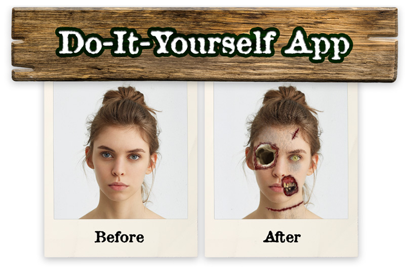 Launch the free Do-It-Yourself app and transform yourself or a friend into a zombie for free! Add realistic gashes, gore, texture, blood, and weapon effects to your photos and share them with the world.